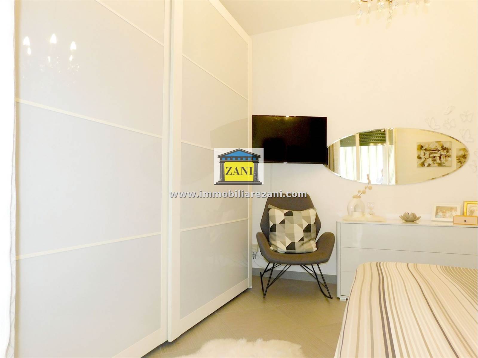 L’ingresso si apre su un ampio disimpegno che conduce al soggiorno luminoso e alla cucina abitabile. La zona notte è composta da due camere da letto, una stanza da bagno con doppio piatto doccia e sanitari sospesi, locale lavanderia e due balconi.