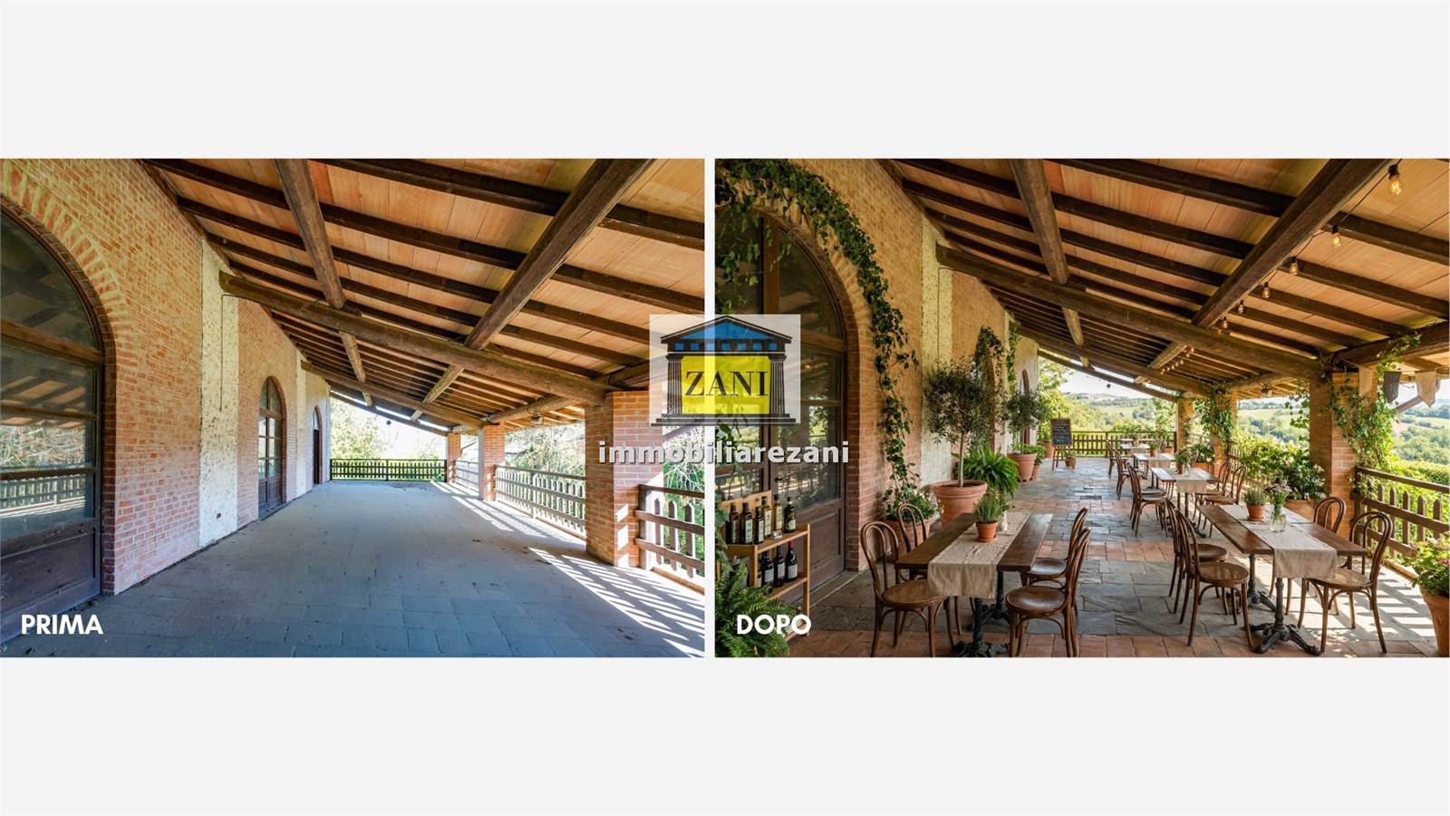 Dallo stesso livello si accede a un'ampia terrazza coperta e loggiato, affacciata sul paesaggio collinare circostante — uno di quei panorami che si vedono e non si dimenticano.